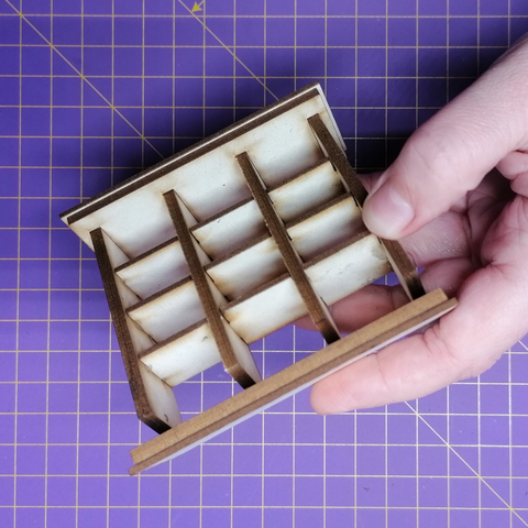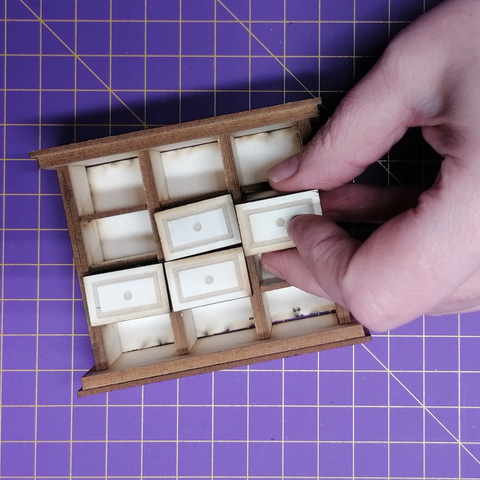 Klebe mit Leim die Rückwand auf. Und sobald der Leim trocken ist, kannst Du schon die Schubladen einstecken.