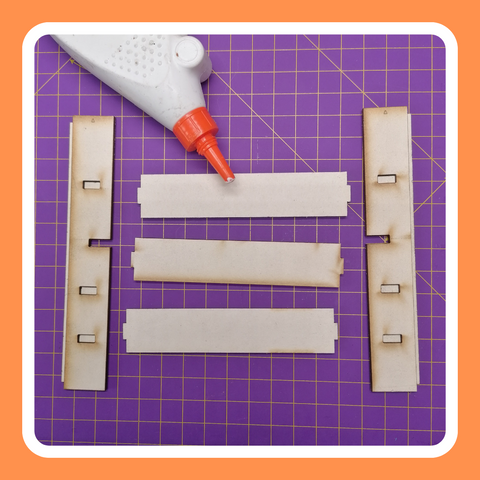 klebe zuerst Boden, Deckel und Mittelteile zusammen, wie auf dem Bild. Hierfür kannst Du Leim aber auch einen Klebestift benutzen.