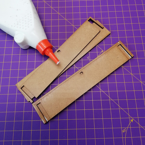 Beginne damit die Seitenteile und die Bodenteile zusammen zu kleben. Achte bei den Seitenteilen darauf das die Schrift (UP) noch zu sehen ist.