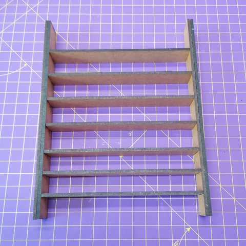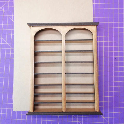 Die beigefügte Pappe ist die Rückwand des Regals. Klebe das Regal auf die Pappe und schneide überstehendes mit einem scharfen Messer ab.