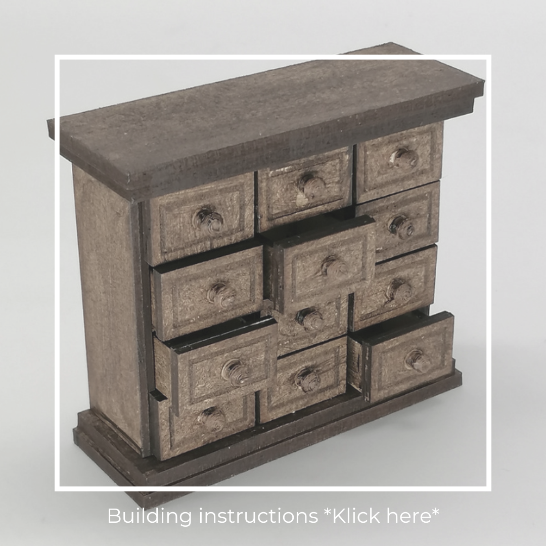 Klebe mit Leim die Rückwand auf. Und sobald der Leim trocken ist, kannst Du schon die Schubladen einstecken.