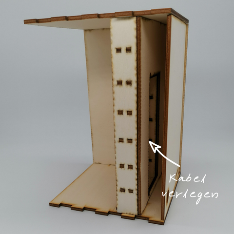 Beklebe oder bemale die Seitenteile, Boden und Decke bevor Du sie zusammensteckst. Wenn Du eine Seite vorerst offen lässt kannst Du einfacher Kabel verlegen und dekorieren.