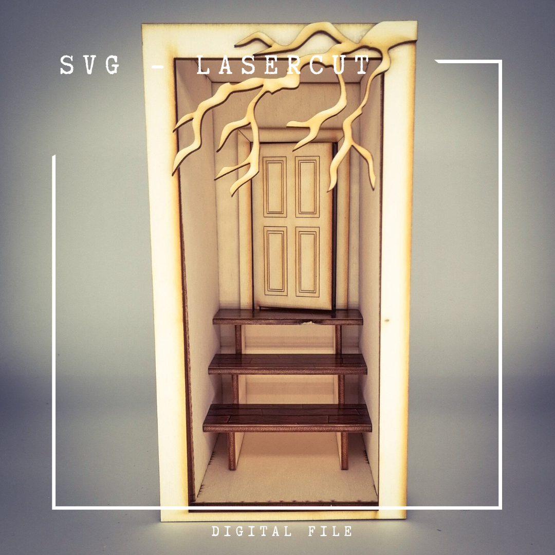 Erschaffe eine faszinierende Miniaturwelt mit dieser digitalen SVG-Schnittdatei! Dieses Design wurde speziell für Lasercut-Maschinen entwickelt und ermöglicht es Dir, einen detaillierten BookNook mit einem charmanten Hauseingang zu erstellen. Dieses BookNook ist perfekt, um zwischen Deinen Büchern platziert zu werden und Deine Bücherregale in eine magische Kulisse zu verwandeln.