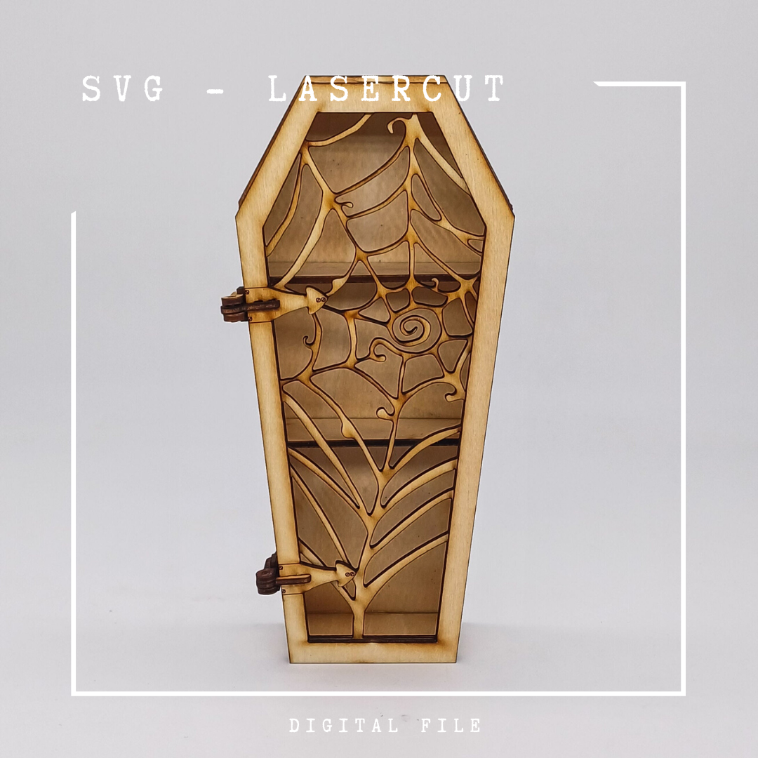 Bringe einen Hauch von Halloween oder Gothic-Charme in Deine Miniaturwelt mit dieser einzigartigen SVG-Schnittdatei! Dieses Design wurde speziell für Lasercut-Maschinen entwickelt und ermöglicht es Dir, ein detailreiches Sargregal mit einer Spinnentür im Maßstab 1:12 zu erstellen. Dieses auffällige Möbelstück ist perfekt, um Deinen Miniaturen oder Deiner Halloween-Dekoration einen gruseligen Akzent zu verleihen.