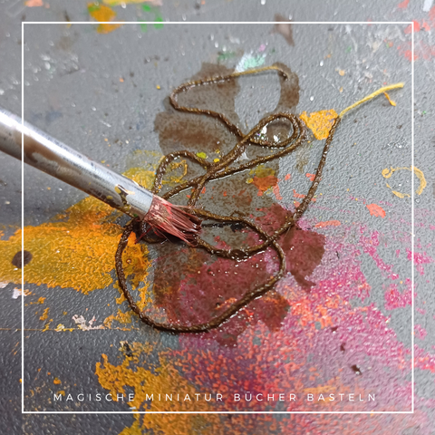 Ein paar Rollen binde ich mit einer Art Lederband ein. Hierfür habe ich einen Bindfaden mit brauner Acrylfarbe bemalt. Du kannst auch Zahnseide so bemalen, daß sie aussieht wie ein flaches Lederband.