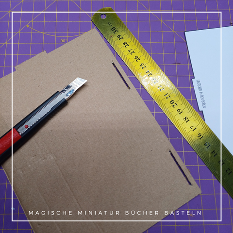 Die Buchseiten schneide ich zuerst (grob) zu und lass dabei die Markierung zum knicken stehen. Jetzt klebe ich auch schon die Beiden Streifen zusammen.