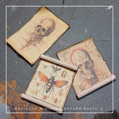Wenn alle bemalte Teile getrocknet sind kannst Du mit einem Zahnstocher oder anderem runden Stab die Schriftrollen einrollen.