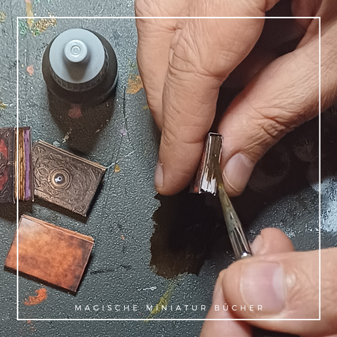 Du kannst noch ein bisschen kreativ werden um sie noch älter aussehen zu lassen.  Ich habe hier dem Buchschnitt mit stark verdünnter, braunen Acrylfarbe bemalt.