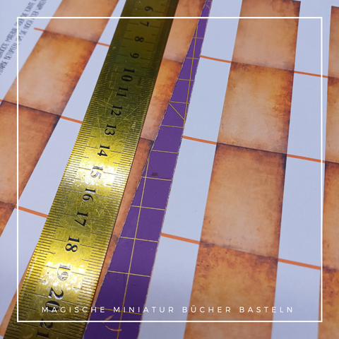 Die Buchseiten schneide ich zuerst (grob) zu und lass dabei die Markierung zum knicken stehen. Jetzt klebe ich auch schon die Beiden Streifen zusammen.