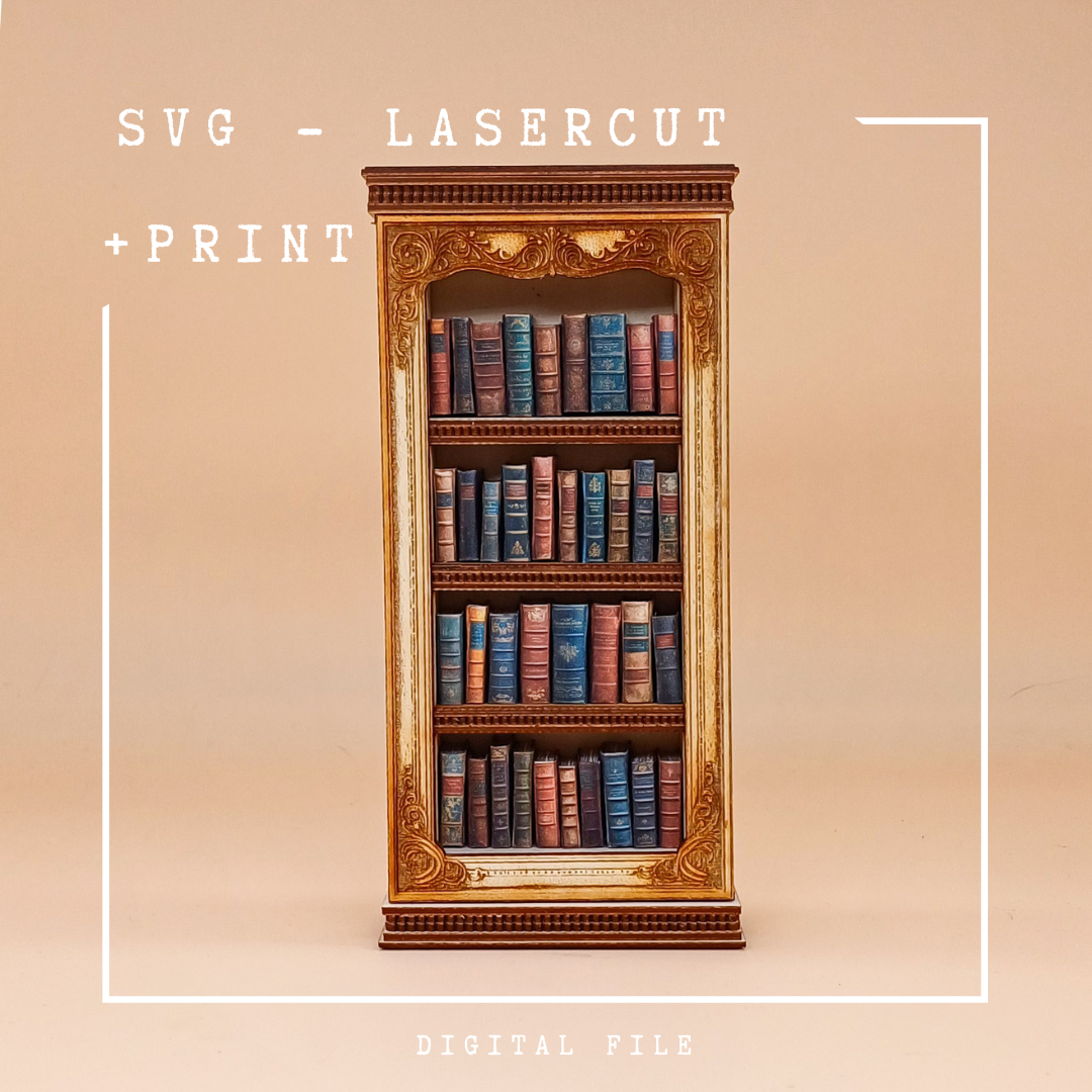 Baue dir deine eigene zauberhafte Miniatur-Bibliothek – im Maßstab 1:12 und perfekt abgestimmt auf 2 mm starkes Material. Dieses Set enthält nicht nur eine reich verzierte Bücherwand als Lasercut-Datei, sondern auch einen liebevoll gestalteten Bastelbogen mit 47 Miniaturbüchern – mehr, als ins Regal passen!