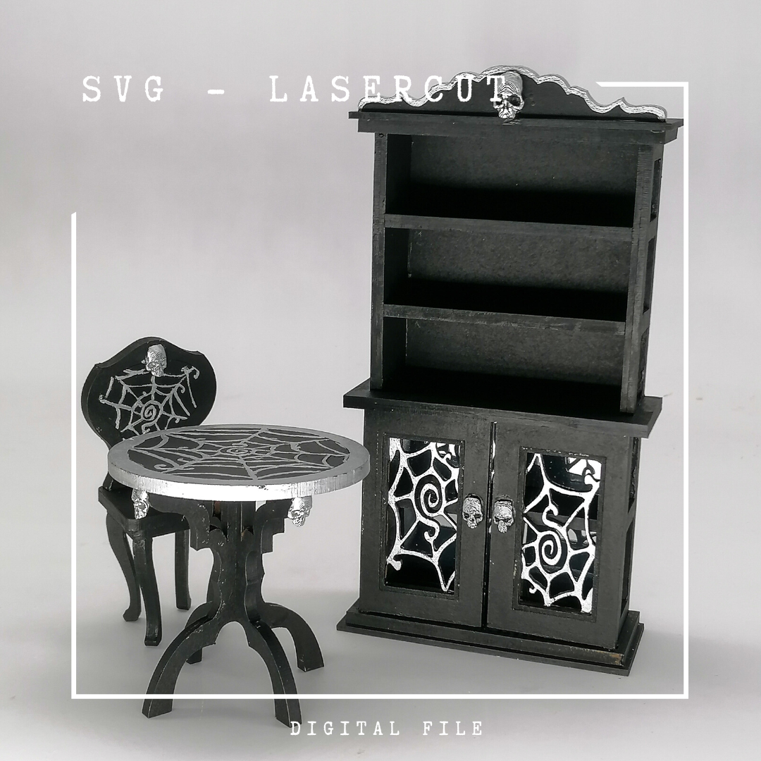 Erschaffe eine geheimnisvolle Atmosphäre in deinem Diorama, Puppenhaus oder Book Nook mit dieser einzigartigen SVG Lasercut-Datei für Hexenmöbel im Maßstab 1:12. Jedes Möbelstück ist kunstvoll mit Spinnenweben verziert, was ihnen einen eindrucksvollen und mystischen Charakter verleiht.