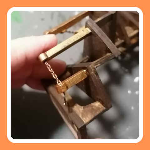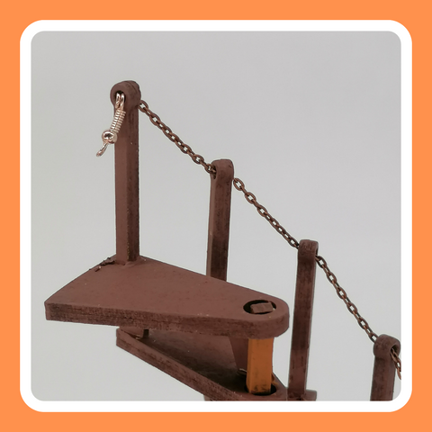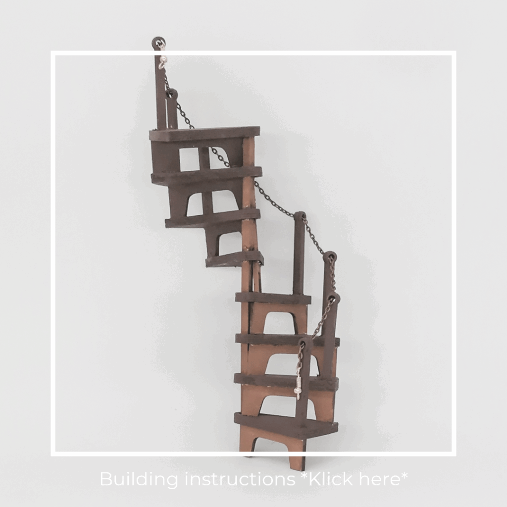 Du kannst die Wendeltreppe mit Acrylfarben bemalen und anschließend die Kette durch die Geländerpfosten fädeln und auf die richtige Länge kürzen. Am offenen Ende bringst Du nur noch die Sicherrung an.